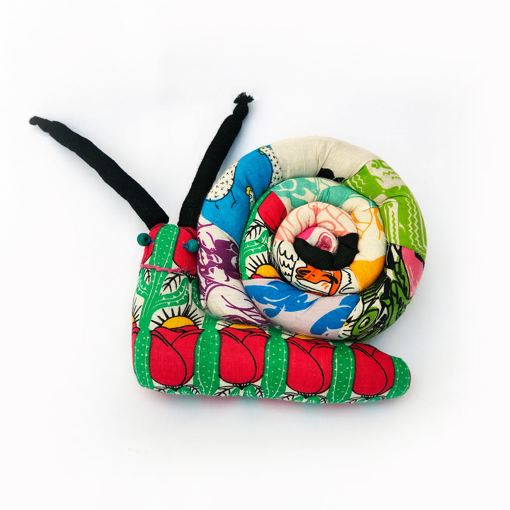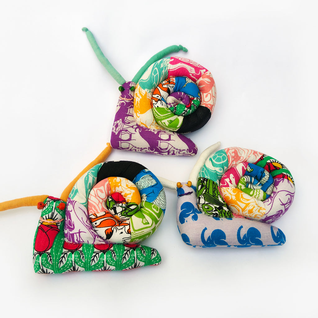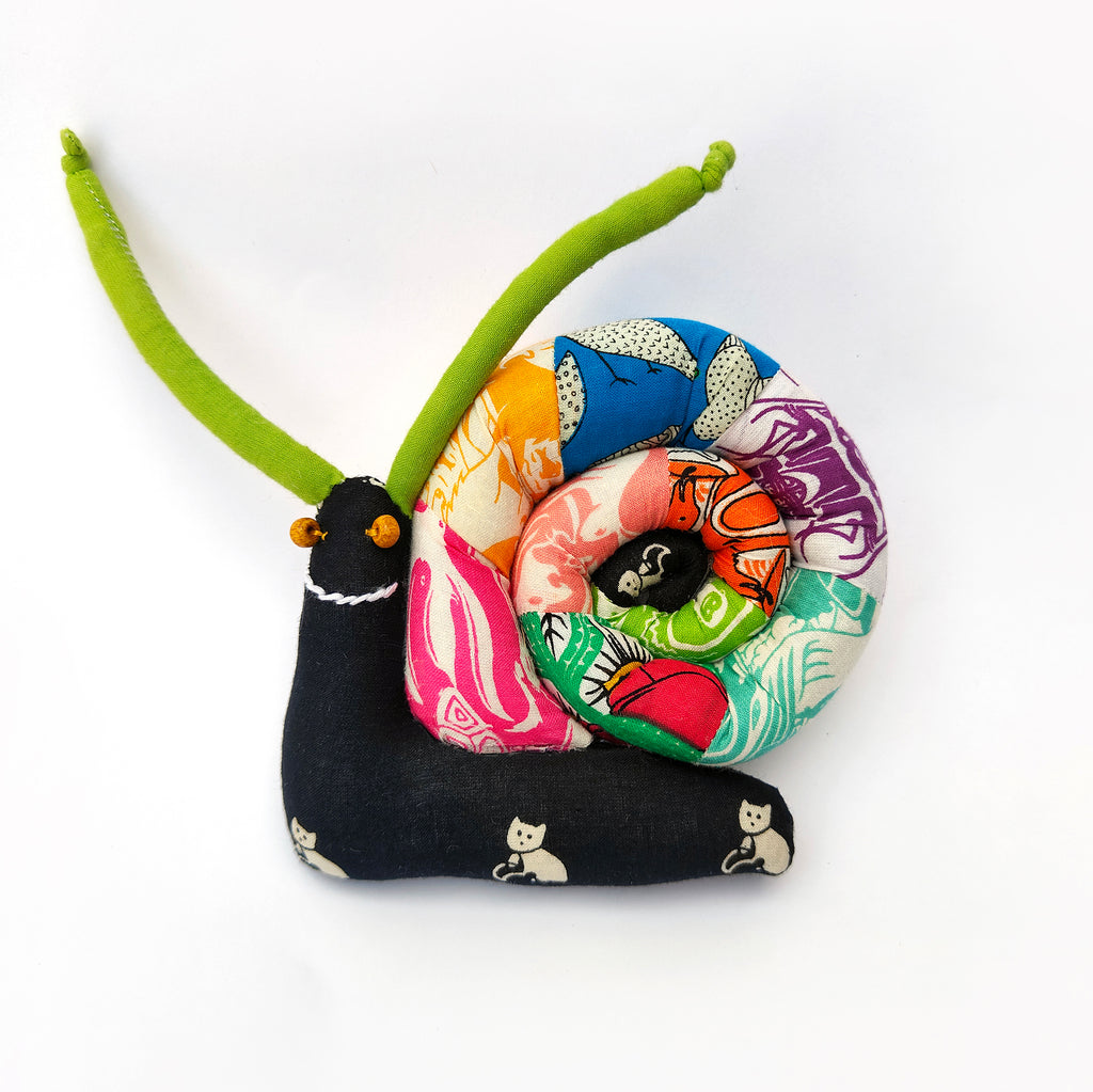 Each snail plush is lovingly handmade, featuring a unique mix of colors, patterns, and textures, making every toy truly one-of-a-kind. No two snails are alike – your plush buddy will be similar in style to the images shown, but with its own special fabric combination.